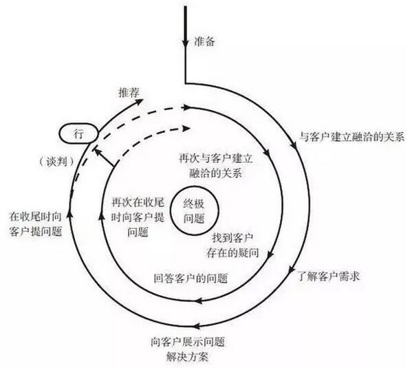 職場(chǎng)上銷售高手都是從拒絕開始的,拒絕是成長(zhǎng)的催化劑。面對(duì)客戶的拒絕,銷售人員要運(yùn)用靈活的銷售策略和技巧去應(yīng)對(duì),把客戶導(dǎo)入上面的銷售循環(huán)圖,了解客戶的真正需求,直至銷售成功。