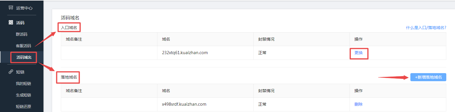 ②設置中心—域名管理—新增域名/購買域名操作完成后,即可在左側導航欄的活碼域名里更換入口域名和新增落地域名。