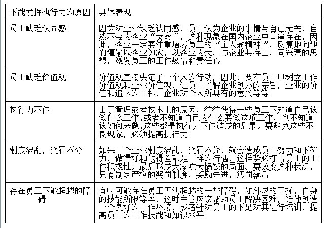 在企業(yè)中,往往存在基層員工不能發(fā)揮執(zhí)行力,或者執(zhí)行不到位的現(xiàn)象,原因有很多,其中主要的原因如表21-2所示。