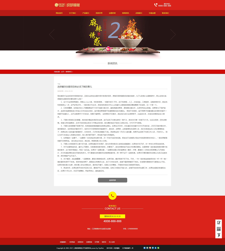 主頁 > 網(wǎng)站建設(shè) > 網(wǎng)站模板 > 酒類、食品、服飾、服務(wù) > 紅色風(fēng)格食品飯店類企業(yè)網(wǎng)站織夢整站模板源碼