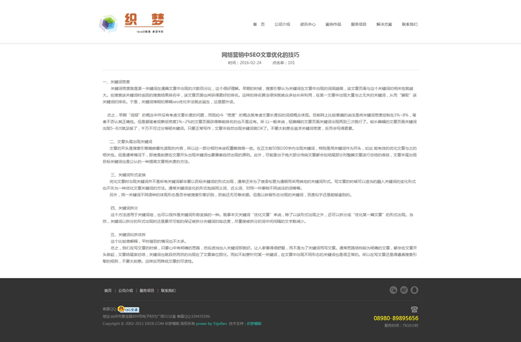 四、注意各個(gè)細(xì)節(jié)的處理,標(biāo)題文字多余隱藏“…”代替,圖片ALT調(diào)用標(biāo)題等,整站代碼兼顧SEO優(yōu)化,代碼工整、非常有利于搜索引擎的蜘蛛抓取及收錄,確保網(wǎng)站的優(yōu)化推廣更加簡(jiǎn)單快捷。