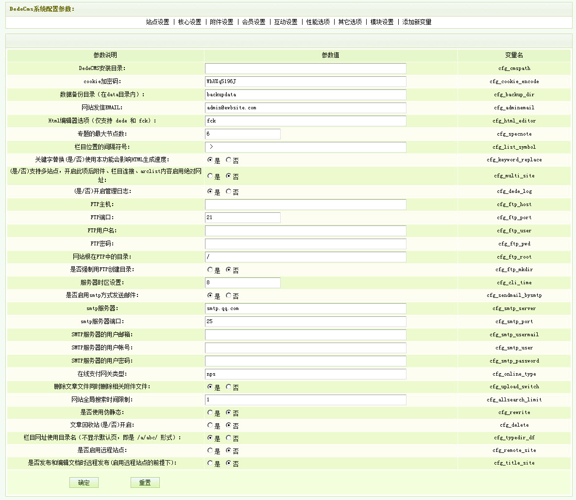 | 網(wǎng)站發(fā)信EMAIL | 設(shè)置網(wǎng)站發(fā)送郵件的回郵地址。 | cfg_adminemail |