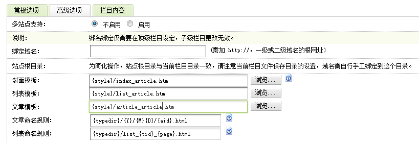 依此類推,如果在常規(guī)選項中欄目屬性是最終列表欄目,高級選項中封面模板為{style}/list_article.htm,則會調(diào)用list_article.htm作為模板,文檔模板也依此類推。