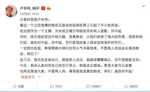 這次事件在網(wǎng)上引發(fā)熱議,目前,部分涉事粉絲已經(jīng)在社交網(wǎng)絡(luò)上公開報歉,盧本偉也于 12 月 8 日在直播及微博上對網(wǎng)友報歉。