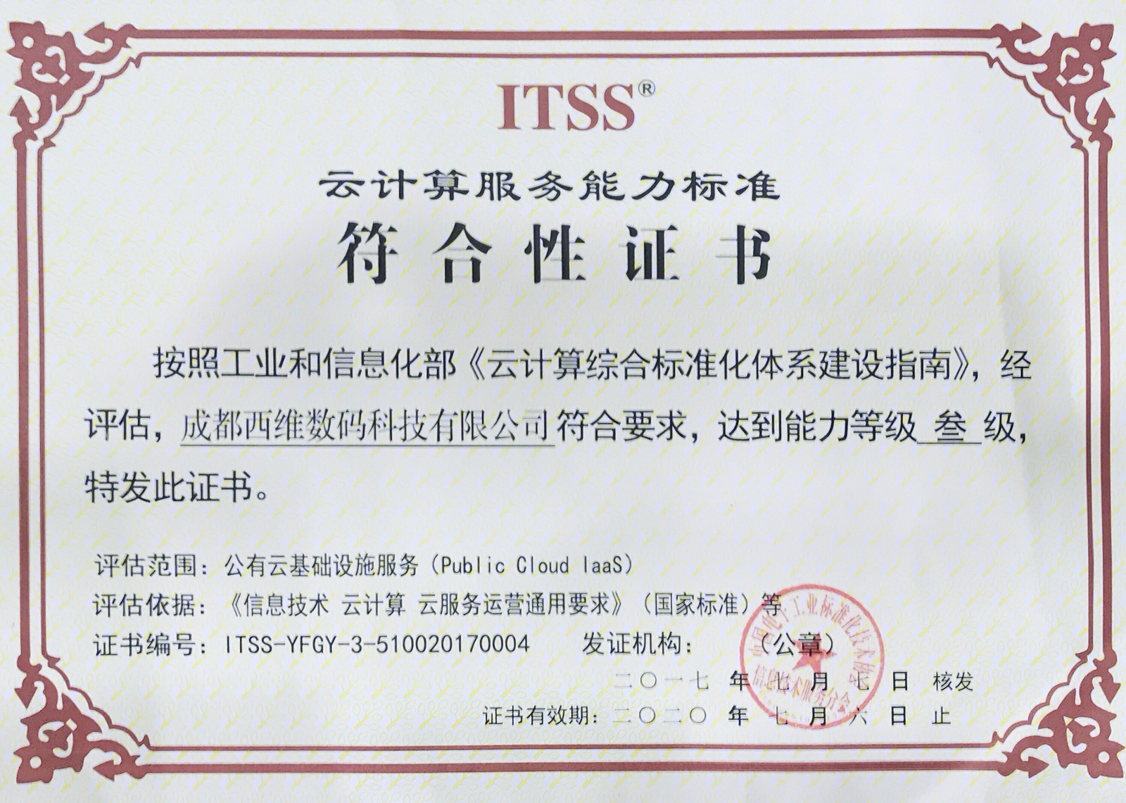 2017 年 7 月 6 日,中國(guó)電子工業(yè)尺度化技術(shù)協(xié)會(huì)信息技術(shù)辦事分會(huì)(簡(jiǎn)稱ITSS分會(huì))公布了最新一批通過(guò)云計(jì)算辦事能力審查評(píng)估的 34 家企業(yè)。其中,西部數(shù)碼憑借卓越的云產(chǎn)品和辦事,順利通過(guò)工信部ITSS公有云辦事評(píng)估,充分展示出西部數(shù)碼在云計(jì)算領(lǐng)域雄厚的實(shí)力。