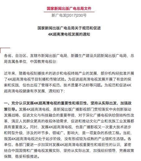 站長(zhǎng)之家(Chinaz.com) 11 月 28 日消息 日前,國(guó)家廣電總局向各省廣電局及相關(guān)單位下發(fā)了《國(guó)家新聞出版廣電總局關(guān)于規(guī)范和促進(jìn)4K超高清電視發(fā)展的通知》,《通知》要求開展4K超高清電視頻道試點(diǎn)和視頻點(diǎn)播業(yè)務(wù)需按要求嚴(yán)格審批辦理,,未經(jīng)批準(zhǔn)不得違規(guī)擅自開展4K業(yè)務(wù)。