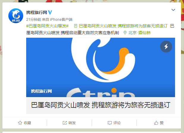 阿貢火山噴發(fā)后,攜程高度關(guān)注本地旅游安適情況,并啟動(dòng)重大自然災(zāi)害應(yīng)急機(jī)制,酒店、機(jī)票、度假、租車、國(guó)際專車、客服等部門通力合作,緊急確認(rèn)在本地旅客的安適情況,并積極協(xié)調(diào)滯留旅客的返程事宜。