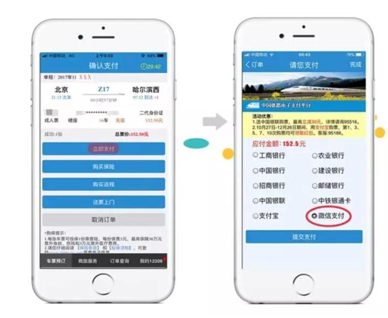 11 月 23 日起,微信支付全面接入 12306 購(gòu)票平臺(tái),用戶(hù)在 12306 官網(wǎng)或官方APP上可使用微信支付購(gòu)買(mǎi)車(chē)票。同時(shí),各城市鐵路局線(xiàn)下購(gòu)票網(wǎng)點(diǎn)及ATM自助售票機(jī)購(gòu)票近期也將陸續(xù)支持微信支付,為旅客提供多線(xiàn)上線(xiàn)下多樣化、個(gè)性化的便捷支付方式。