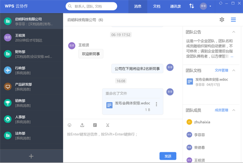 除了共同撰寫和編纂文檔,WPS云協(xié)作還能按照企業(yè)組織架構為每個部門自動創(chuàng)建聊天群組,團隊成員除了可在群組里直接發(fā)起群聊外,還能發(fā)起一對一私聊。聊天窗口不但可以發(fā)起協(xié)作文檔,還可以邊溝通邊記錄要點。