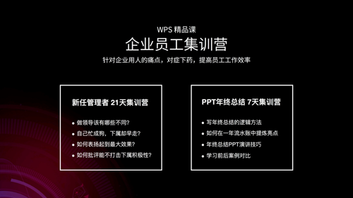 利用午休或短暫的空閑時間,小微企業(yè)員工便可在線看完一個營銷計劃。對于進入不變發(fā)展期的小微企業(yè)而言,WPS精品課可按照公司的需求,有針對性地推出長期的培訓計劃,或臨時的急訓等。在節(jié)省成本的同時,WPS精品課又能給小微企業(yè)員工提供最優(yōu)質的培訓。