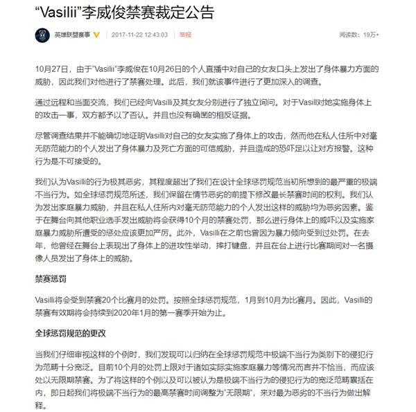 今中午,英雄聯(lián)盟賽事官微公布了對“Vasilii”李威俊禁賽的裁定公告,李威俊受到禁賽 20 個角逐月的處罰,也就是到 2020 年 1 月的第一賽季開始為止。