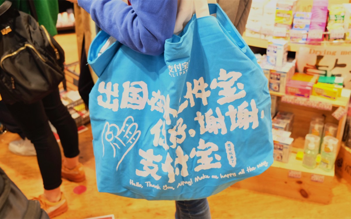 為了便利支付寶用戶在日本掃貨,,在多慶屋購物并用支付寶付款的用戶都還能得到一個(gè)巨大的布袋,上書“出門在外三件寶,你好謝謝支付寶”。此外,我還在御殿場的奧特萊斯,成田機(jī)場的免稅店和池袋的 BIC CAMERA 店別離使用了支付寶進(jìn)行支付,在進(jìn)入日本兩年之后,這些地方的收銀員對支付寶看起來都已經(jīng)非常熟悉了。