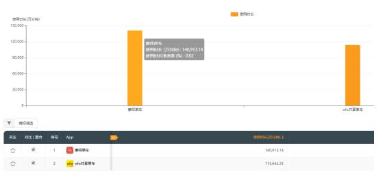 QuestMobile的數(shù)據(jù)顯示,,本年 9 月,摩拜單車用戶的總使用時間長達(dá)14. 1 億分鐘,而ofo用戶為11. 4 億分鐘;摩拜領(lǐng)先ofo小黃車超過 3 億分鐘,領(lǐng)先ofo超過 24 個百分點。綜合看來,摩拜單車用戶黏性更高,遙遙領(lǐng)先ofo等其他玩家。