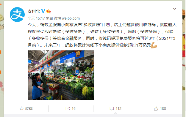 支付寶體現(xiàn),螞蟻金服的“多收多賺”計劃包孕:即時貸款(多收多貸)、理財(多收多得)、賒購(多收多賒)、保險(多收多保)等綜合金融辦事。同時,收錢碼提現(xiàn)免費辦事將再延 3 年( 2021 年 3 月前)。未來三年,螞蟻將累計為線下小商家提供貸款超過 1 萬億元。