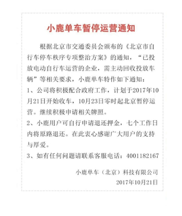 巨人網(wǎng)絡(luò)通訊聲明:本文標(biāo)題《小鹿單車頒布頒發(fā)暫停北京業(yè)務(wù) 用戶可申請(qǐng)退押金》,本文關(guān)鍵詞 小鹿,單車,頒布,頒發(fā),暫停,;如發(fā)現(xiàn)本文內(nèi)容存在版權(quán)問(wèn)題,煩請(qǐng)?zhí)峁┫嚓P(guān)信息告之我們,我們將及時(shí)溝通與處理。本站內(nèi)容系統(tǒng)采集于網(wǎng)絡(luò),涉及言論、版權(quán)與本站無(wú)關(guān)。