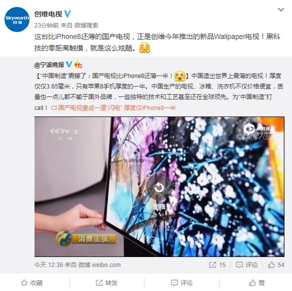 今日,@創(chuàng)維電視 轉發(fā)央視財經(jīng)報道視頻體現(xiàn):“比iPhone8 還薄的電視,燃爆你們的眼球,讓黑科技不只是說說罷了。這款集美貌與實力的電視,正是創(chuàng)維新品Wallpaper。”