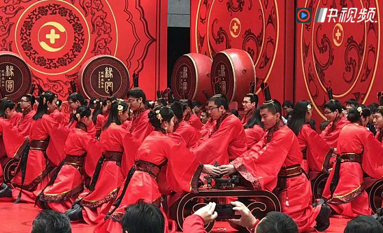 這場婚禮以“緣·圓”為主題,這也是360舉辦的第五屆集體婚禮。現(xiàn)場幾名白衣紅裙女子或斜抱琵琶,或輕撫古箏,演繹出古風濃郁的開場序曲?;槎Y使用的桌榻和器皿也完全根據(jù)漢代禮儀定制,快視頻網(wǎng)友驚呼,“這場婚禮簡直穿越了2000年!”