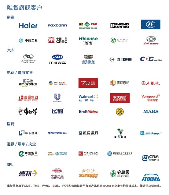 目前唯智信息旗下OMS、TMS、WMS、BMS、ROS、LRCS、TCS和物流鏈云平臺(tái)等產(chǎn)品為制造、零售、快消、醫(yī)藥、電商、冷鏈、汽車、3PL等十大行業(yè)1000等多家企業(yè)節(jié)約物流成本,提升供應(yīng)鏈效率。