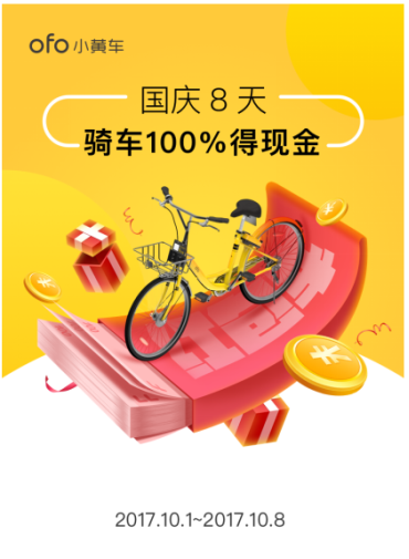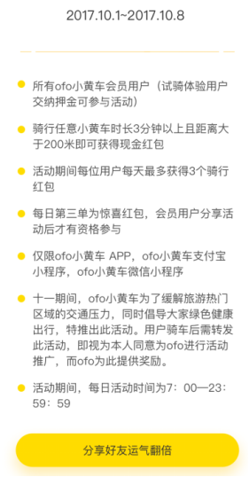 在為期8天的國(guó)慶長(zhǎng)假期間,ofo全國(guó)各地繳納押金及芝麻信用免押金的用戶,均可領(lǐng)取現(xiàn)金紅包獎(jiǎng)勵(lì)。在10月1日-8日每天早上7點(diǎn)到晚上23點(diǎn)59分之間,全國(guó)所有ofo小黃車都會(huì)有紅包隨機(jī)派送,每個(gè)紅包金額在100元以內(nèi)。用戶只要騎行小黃車超過(guò)3分鐘,而且距離大于200米,即可獲得現(xiàn)金紅包,每位用戶每天最多可獲得3個(gè)現(xiàn)金紅包。
