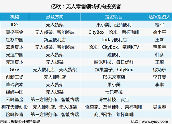 作為“風(fēng)口制造機(jī)”,各路VC自然不會放過無人零售這樣一個性感的概念。有趣的是,與以往差別,這次VC們似乎一致看好這個標(biāo)的目的,各種風(fēng)格的機(jī)構(gòu)都已經(jīng)入場,豈論是投天使早期的還是投B、C輪的,豈論是一線大機(jī)構(gòu)還是VC新興力量,也有原先較少涉及零售或O2O領(lǐng)域的機(jī)構(gòu)??梢韵胍?,這次不會有“錯失 50 億美金共享單車的吳世春”了。