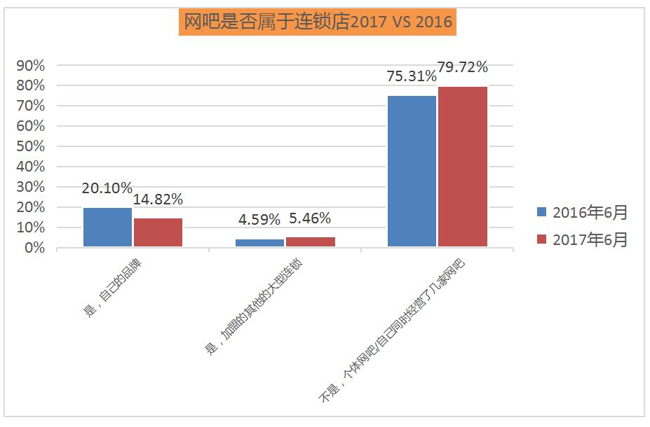 按照順網(wǎng)大數(shù)據(jù)陳訴藍(lán)皮書發(fā)布解密網(wǎng)吧娛樂產(chǎn)業(yè)顯示, 2017 年單體網(wǎng)吧市場(chǎng)占有率高達(dá)79.72%,相較于 2016 年75.31%增長(zhǎng)了近 4 個(gè)百分點(diǎn),自有品牌網(wǎng)吧份額縮減近 5 個(gè)百分點(diǎn)至14.82%,加盟的其他大型連鎖網(wǎng)吧增長(zhǎng)近不到一個(gè)百分點(diǎn),這也給了電競(jìng)館從業(yè)者巨大機(jī)會(huì)。