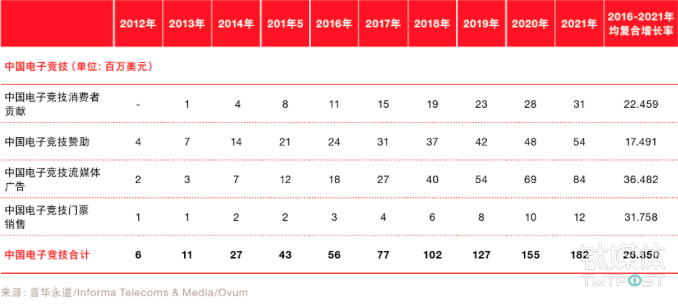 普華永道 2016 年- 2021 年中國(guó)娛樂及媒體市場(chǎng)展望指出,中國(guó)電子競(jìng)技門票在 2021 年銷售規(guī)模將高達(dá) 1200 萬美元,年均復(fù)合增長(zhǎng)率僅次于流媒體廣告為31.758%,消費(fèi)者的直接貢獻(xiàn)和企業(yè)贊助增長(zhǎng)表示亦不俗。