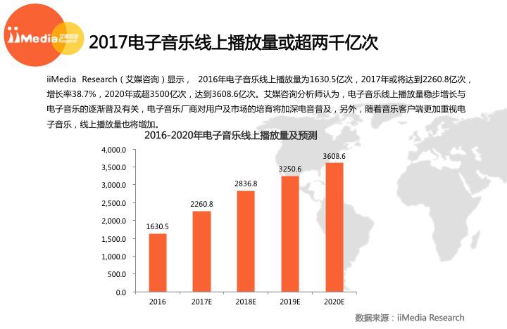 iiMedia Research(艾媒咨詢)顯示,2016 年電子音樂線上播放量為1630. 5 億次,, 2017 年或?qū)⑦_(dá)到2260. 8 億次,增長率38.7%, 2020 年或超 3500 億次,達(dá)到3608. 6 億次。艾媒咨詢分析師認(rèn)為,電子音樂線上播放量穩(wěn)步增長與電子音樂的逐漸普及有關(guān),電子音樂廠商對用戶及市場的培育將加深電音普及,別的,隨著音樂客戶端更加重視電子音樂,線上播放量也將增加。