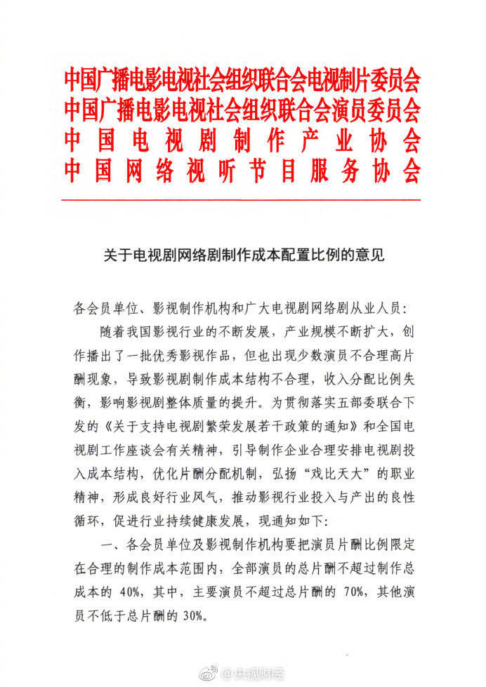 針對演員天價片酬現(xiàn)象,今日《關(guān)于電視劇網(wǎng)絡(luò)劇制作成本配置比例的意見》發(fā)布:要把演員片酬比例限定在合理的制作成本范圍內(nèi),全部演員的總片酬不超過制作總成本的40%,其中,主要演員不超過總片酬的70%,其他演員不低于總片酬的30%。要求要把德藝雙馨作為職業(yè)抱負和目標(biāo)追求,自覺抵制分歧理高片酬等不良行業(yè)風(fēng)氣。