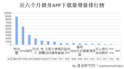 下載增量最多的為悅動圈,增長8842萬,其次為keep,增長5795萬,比擬之下,排在后面的咕咚、樂動力、悅跑圈、云狐運動、火辣健身等APP近六個月下載增量較低。