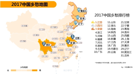 距離闔家團(tuán)圓的中秋節(jié)還有半個多月時間,網(wǎng)上一份關(guān)于“鄉(xiāng)愁”的地圖搶先出爐了。今日,曾連續(xù)兩年制作“中國孝心地圖”的網(wǎng)友“年輕泰”再次發(fā)布 2017 中國鄉(xiāng)愁地圖,依次列出中國各省鄉(xiāng)愁排名。其中,江蘇、四川、安徽占據(jù)前三,東三省排名靠后。( 9 月 18 日《北京晨報》)