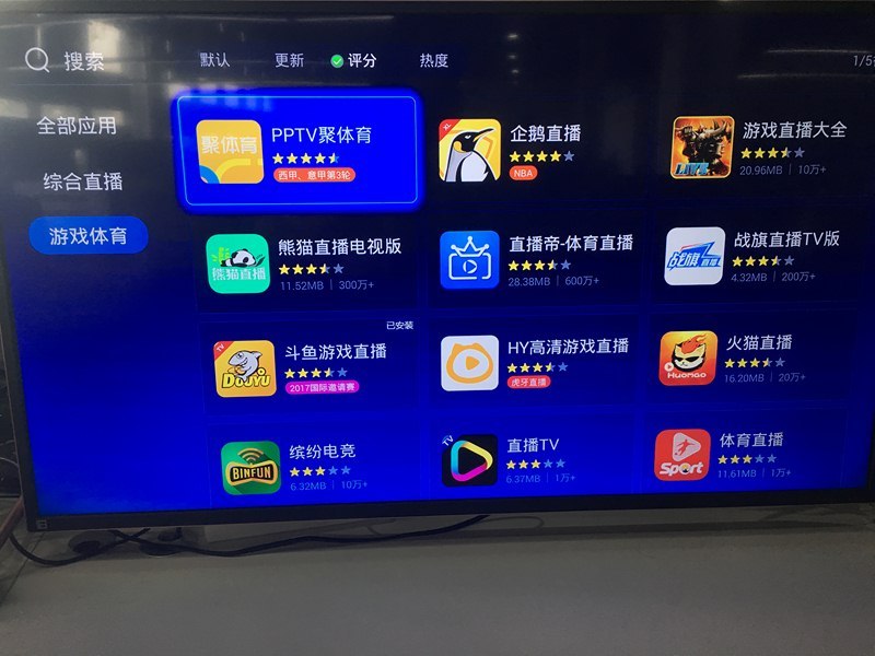 在這里詳細(xì)羅列了電視、游戲、體育三塊的直播應(yīng)用,新用戶如果不知道該選擇什么直播應(yīng)用,可通過上排的更新、評(píng)分、熱度來給眾多應(yīng)用排序,擇優(yōu)打開哦。