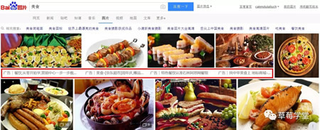 百度圖片的原生廣告,廣告圖片和其它搜索出來的圖片高度一致,除了圖片下面的一小行文字備注外,看不出來不同。
