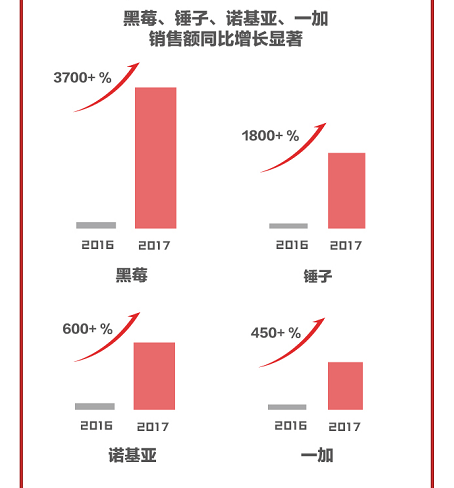 此次京東3C手機 8 月銷量風云榜,全方位、多維度地呈現(xiàn)了 8 月各大手機品牌廠商在京東的市場表示。其中,黑莓和夏普在回歸伊始,就憑借新品S2 和KEYone取得了優(yōu)異的銷量成績,成為京東手機 8 月亮點,黑莓更是一路高歌凱旋,銷售額同比增長突破3700%,而且以新晉品牌身份躋身環(huán)比 7 月銷額的Top 15。