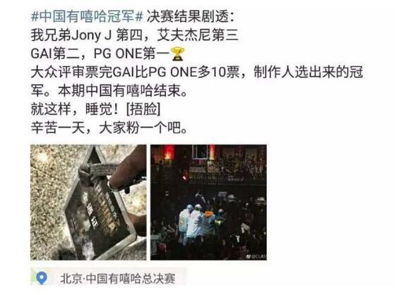 由于到最后制作人投票環(huán)節(jié)這段被掐了,所以網(wǎng)友們看不了直播。但去了現(xiàn)場的童鞋們爆料,最終的中國有嘻哈總冠軍,是PGONE,并頒發(fā)了祝賀。