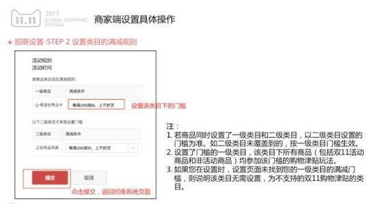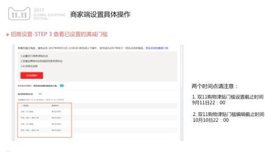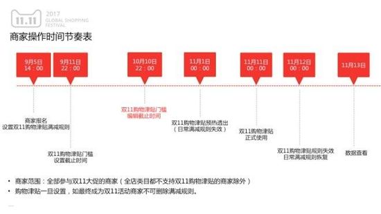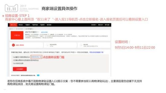 已經(jīng)入圍的店鋪商家,在 9 月 5 日至 9 月 11 日期間,要完成購物津貼設(shè)置、運費險協(xié)議、誠信經(jīng)營協(xié)議,及其他 2017 雙十一活動相關(guān)法律文本/增補報名信息的設(shè)置。