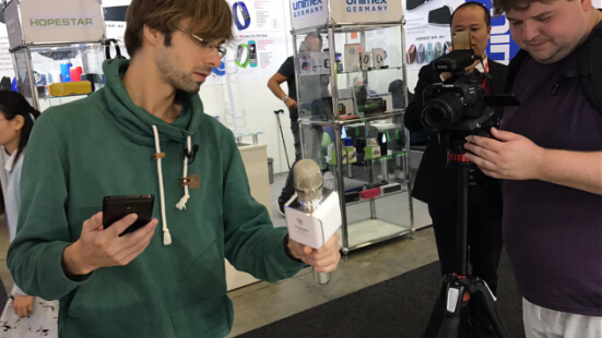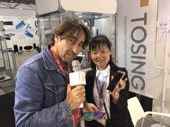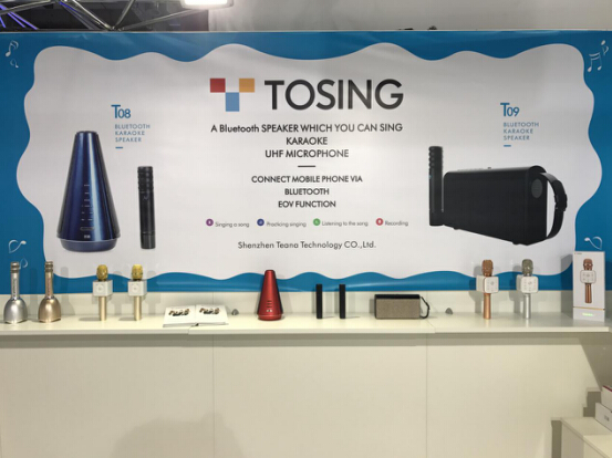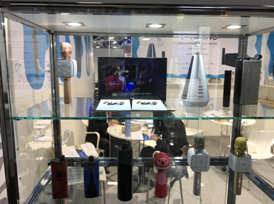 筆者參不雅觀該展位后,了解到,途訊展出的產(chǎn)品,是一種麥克風(fēng)與喇叭結(jié)合的一體機,通過藍(lán)牙連接手機后,打開手機內(nèi)的K歌APP,就可以隨時K歌,還帶有混響和消除原音的功能。
