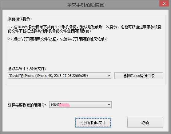 在“蘋果手機(jī)陌陌恢復(fù)”對(duì)話框中,如下圖點(diǎn)擊“打開陌陌庫文件”按鈕,就能查看需要恢復(fù)陌陌號(hào)的聊天記錄了。如果有多個(gè)陌陌號(hào),可以通過陌陌號(hào)的下拉框進(jìn)行選擇。