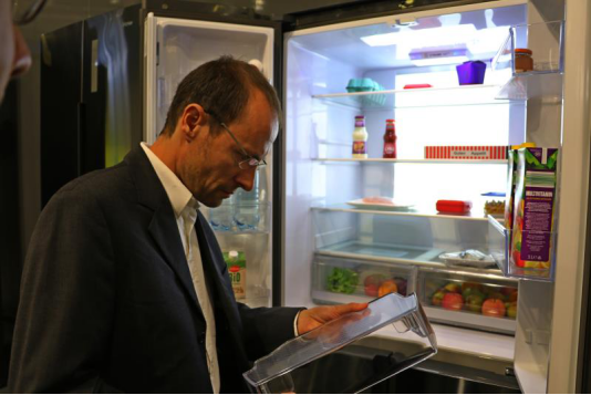 聽完講解后,Torsten Redlich迫不及待的體驗了這款全球唯一實現全空間保鮮的冰箱。從“橫看成嶺側成峰”到“遠近凹凸各差別”,Torsten Redlich從差別的角度細細的審視了這款冰箱,還時時地拿起冰箱保鮮盒檢查產品設計方面的細節(jié)。不但如此,他還打開冰箱冷凍室,對每一個冷藏層都“找了茬”。