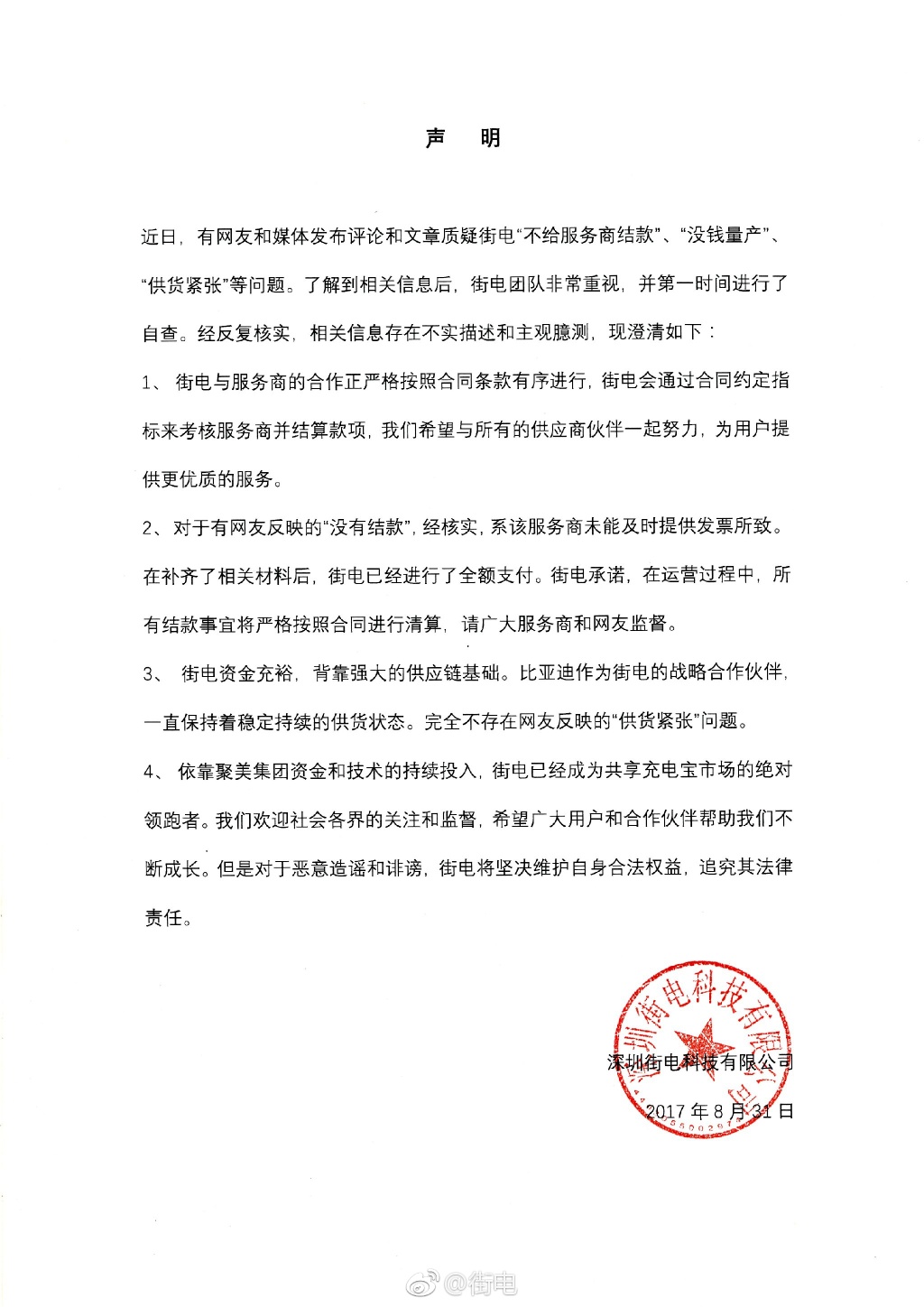 站長之家(Chinaz.com) 8 月 31 日 近日,有消息稱共享充電寶公司街電科技出現“不給辦事商結款”、“沒錢量產”、“供貨緊張”等問題。對于該傳聞,街電官方做出了解釋。