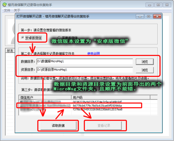 4,在電腦上安置并打開(kāi)“樓月微信聊天記錄導(dǎo)出恢復(fù)助手”軟件,樸素的軟件界面卻蘊(yùn)含著豐富的功能,我們按下圖進(jìn)行設(shè)置后,并按箭頭指示的挨次進(jìn)行操作。