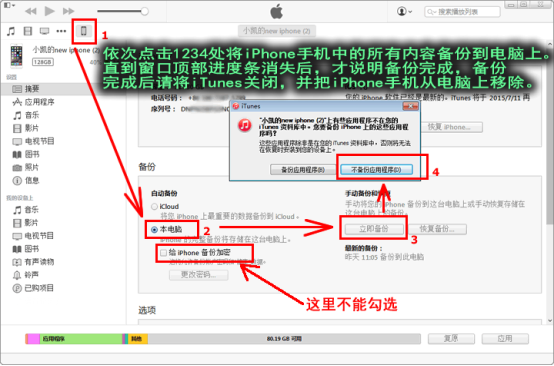 2,接下來(lái)要在電腦上使用iTunes軟件,把手機(jī)存儲(chǔ)中的所有文件都備份到電腦上來(lái)。說(shuō)明:備份會(huì)將手機(jī)iOS系統(tǒng)中的全部文件(含微信記錄,短信內(nèi)容,照片等所有文件)都備份到電腦硬盤(pán)上來(lái)。