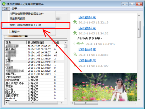 5,此時(shí)界面上就會(huì)出現(xiàn)讓我們驚喜的內(nèi)容,與好友的所有記錄就依次顯示在了界面上。我們接著點(diǎn)擊“文件”,“恢復(fù)已刪除的微信聊天記錄”菜單。