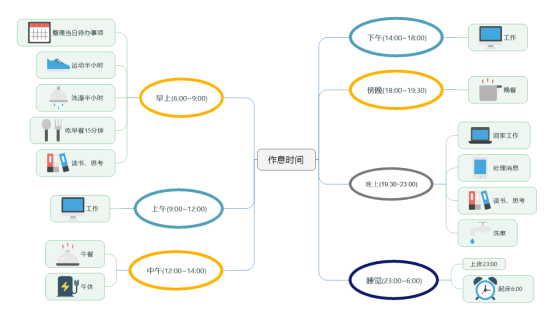 當(dāng)你每天趕到公司辦公室面對一堆雜七雜八的事情,是否感覺到無從下手?這時候我們可以使用思維導(dǎo)圖規(guī)劃本身一天的工作和生活擺設(shè),這可以減少你的工作焦慮,讓你十分清楚本身現(xiàn)在在干什么,接下來要干什么,什么時候需要休息。