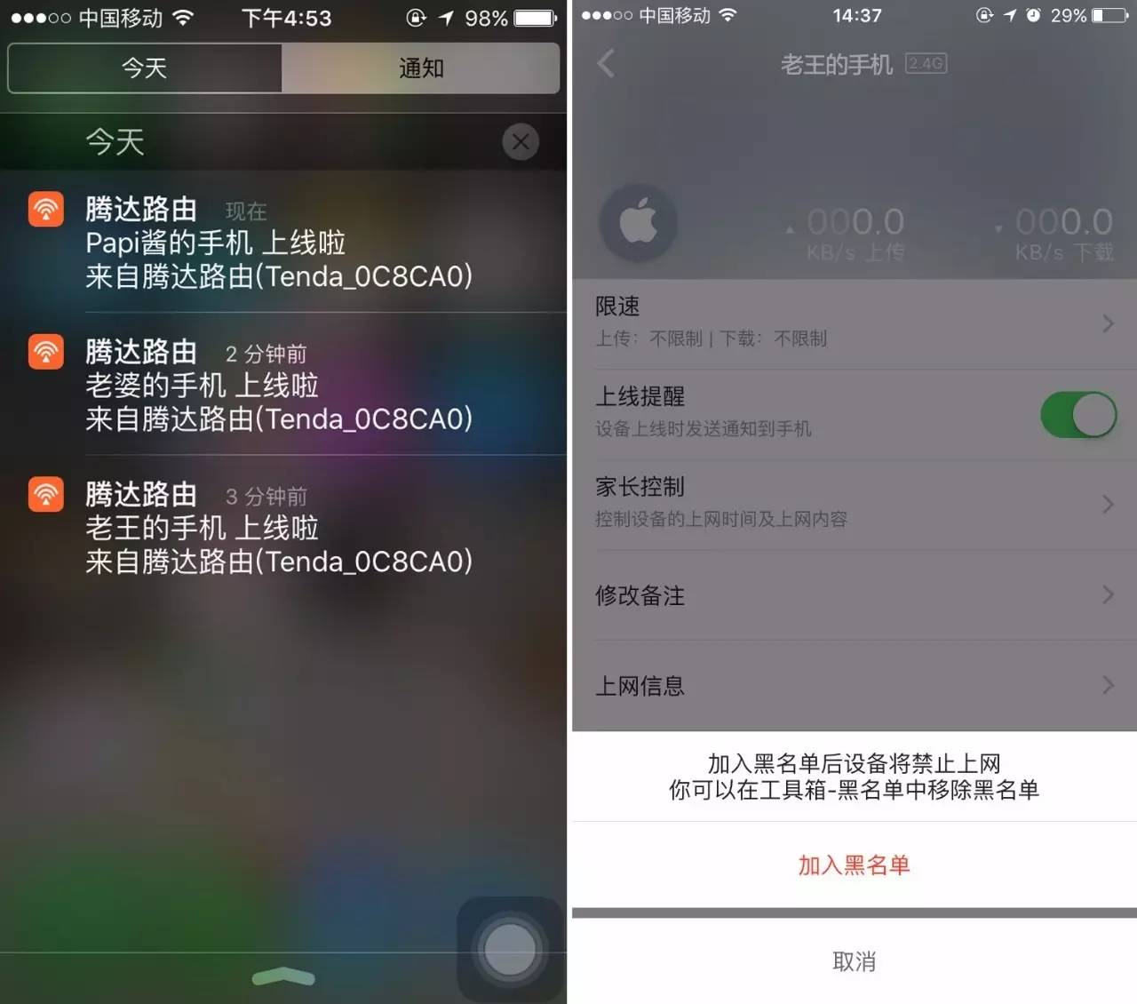 智能APP,一鍵拉黑。騰達(dá)智能路由APP,配備陌生設(shè)備接入提醒功能,發(fā)現(xiàn)陌生設(shè)備時(shí),還可進(jìn)行一鍵拉黑。