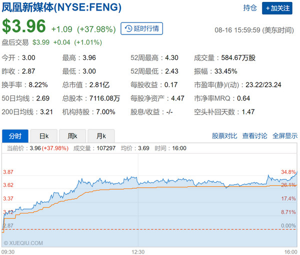 亮眼的財報公布后,鳳凰新媒體股價暴漲37.6%,漲幅創(chuàng)紀錄,并在當天即抹去年內全部跌幅,轉較去年底上漲26%,收在近 6 個月來最高位3. 95 美元;成交量接近三個月日均量的 70 倍,環(huán)比增加了 123 倍,三個交易日累計上漲43%。