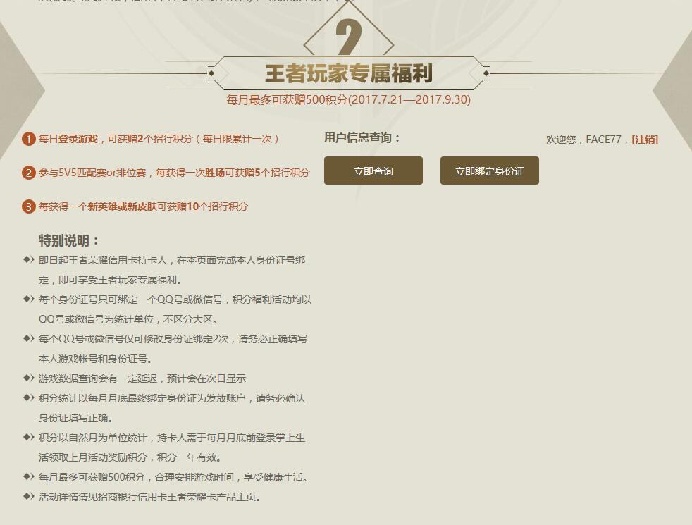 此外,王者榮耀信用卡持卡人還能享有游戲玩家福利,每日登陸游戲、參與5V5 匹配賽or排位賽以及每獲得一個新英雄或新皮膚都可獲得相應的招行積分。