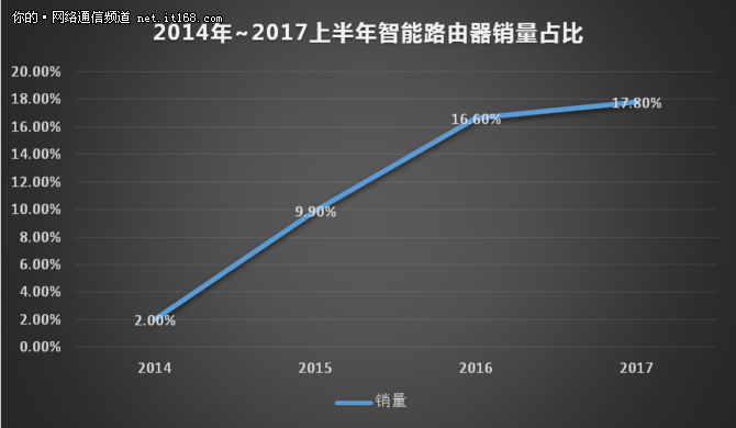 ▲(折線圖: 2014 年~ 2017 上半年智能路由器銷量占比)