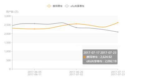 QuestMobile數(shù)據(jù)顯示,在APP使用次數(shù)方面,從 6 月 5 日至 11 日— 7 月 17 日至 23 日的雙月走勢來看,摩拜單車周APP使用次數(shù)從 18269 萬次增長至 23313 萬次,增幅為28%;ofo則從 17443 萬次下滑至 11727 萬次,降幅為33%。摩拜領(lǐng)先99%。