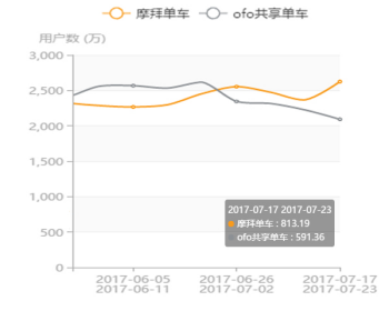 在 7 月 17 日至 23 日周日均活躍用戶量數(shù)據(jù)上,摩拜為 813 萬,ofo則為 591 萬,摩拜領(lǐng)先38%。在周日均活躍用戶量雙月走勢即 6 月 5 日至 11 日到 7 月 17 日至 23 日中,摩拜從 659 萬增長至 813 萬,增幅為23%,ofo從 839 萬下滑至 591 萬,降幅為30%。