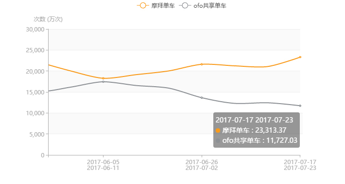 QuestMobile數(shù)據(jù)顯示,在 7 月 17 日至 23 日周使用次數(shù)數(shù)據(jù)上,摩拜為 23313 萬次,ofo為 11727 萬次,摩拜領(lǐng)先99%。在周使用次數(shù)雙月走勢即 6 月 5 日至 11 日到 7 月 17 日至 23 日中,摩拜從 18269 萬次增長至 23313 萬次,增幅為28%,,ofo則從 17443 萬次下滑至 11727 萬次,降幅為33%。